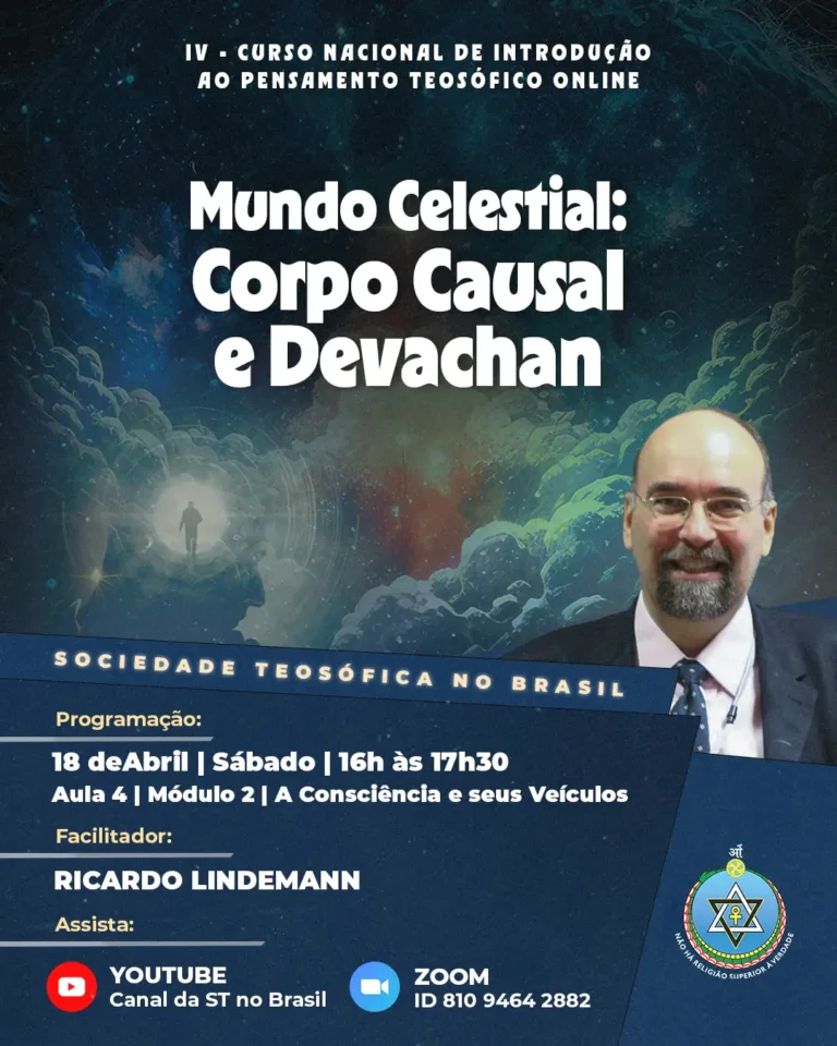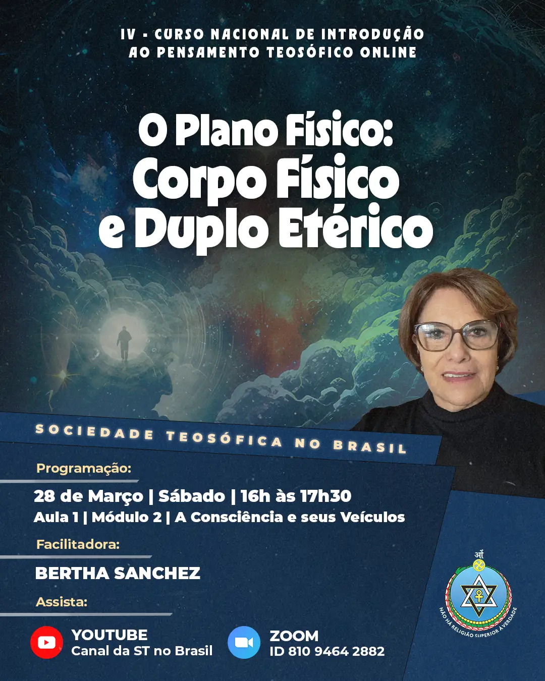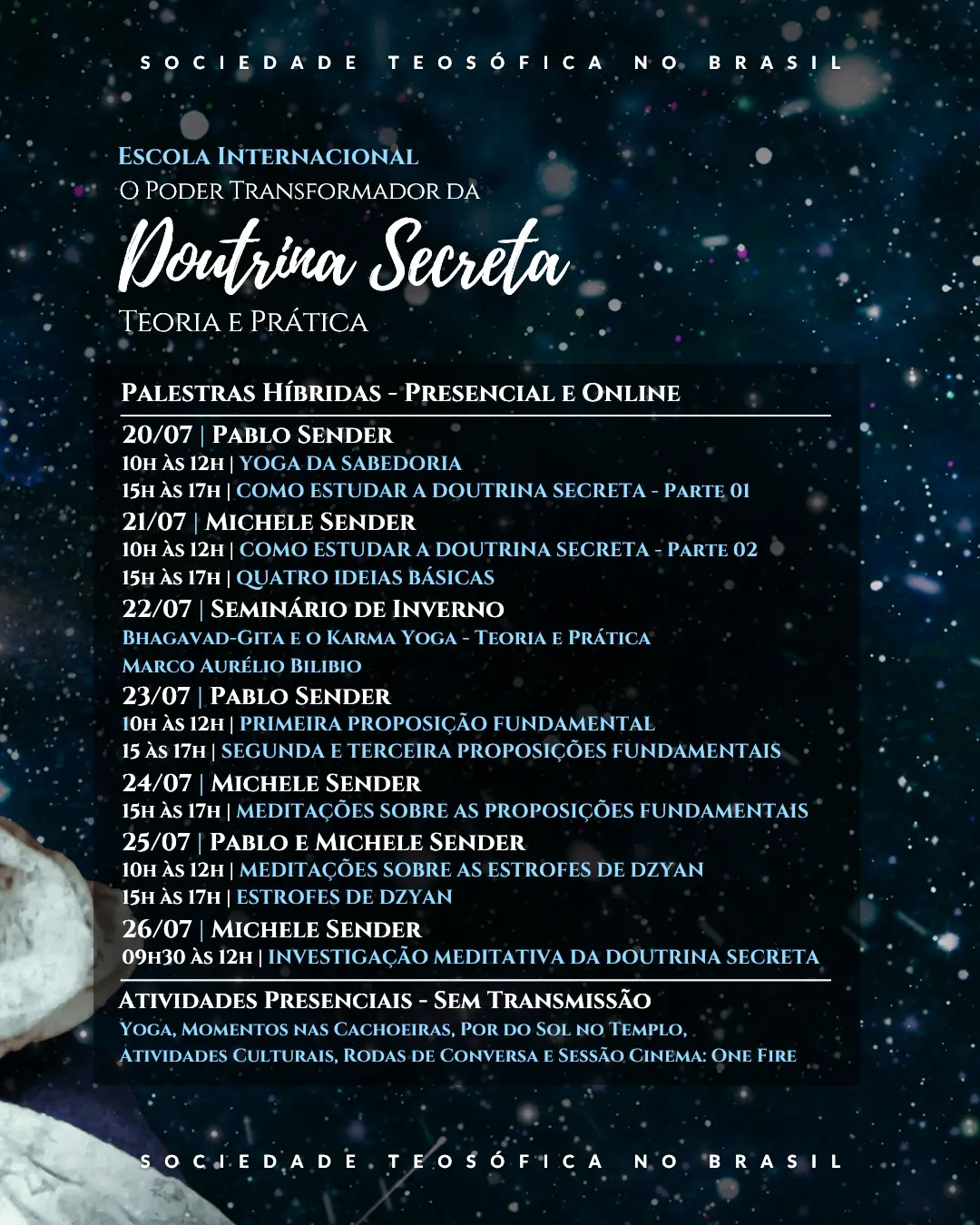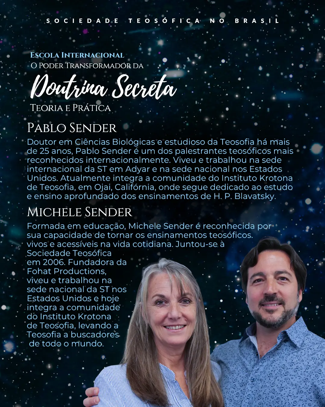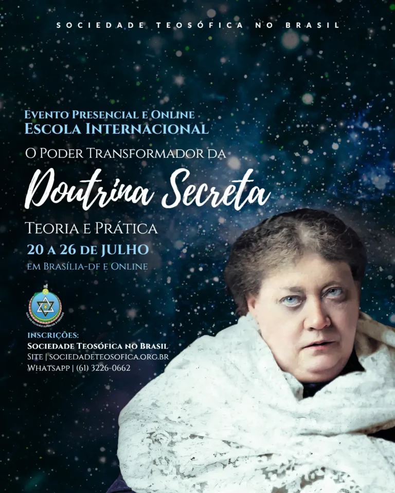 A Doutrina Secreta é a obra central do movimento teosófico moderno. Em nossa Escola Internacional faremos uma imersão em seu conteúdo, aprofundando reflexões sobre a Sabedoria das Idades com momentos de estudo e meditação contemplativa — explorando ensinamentos sobre a origem do universo, a evolução da humanidade e as leis espirituais que regem a vida, integrando ciência, filosofia e espiritualidade em uma visão profunda e transformadora.