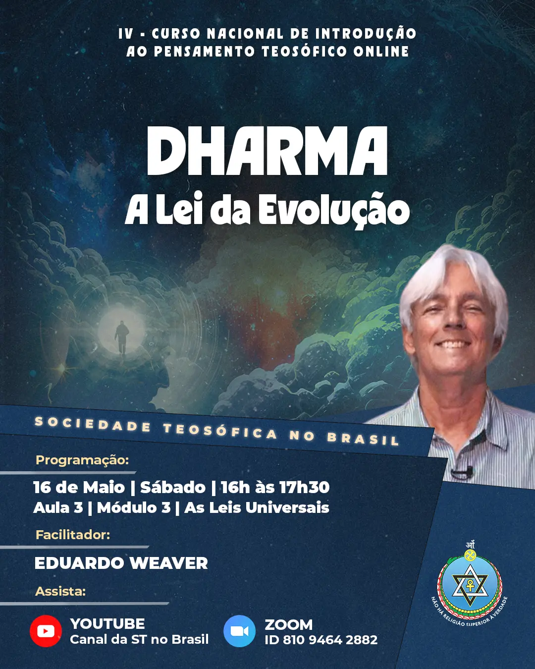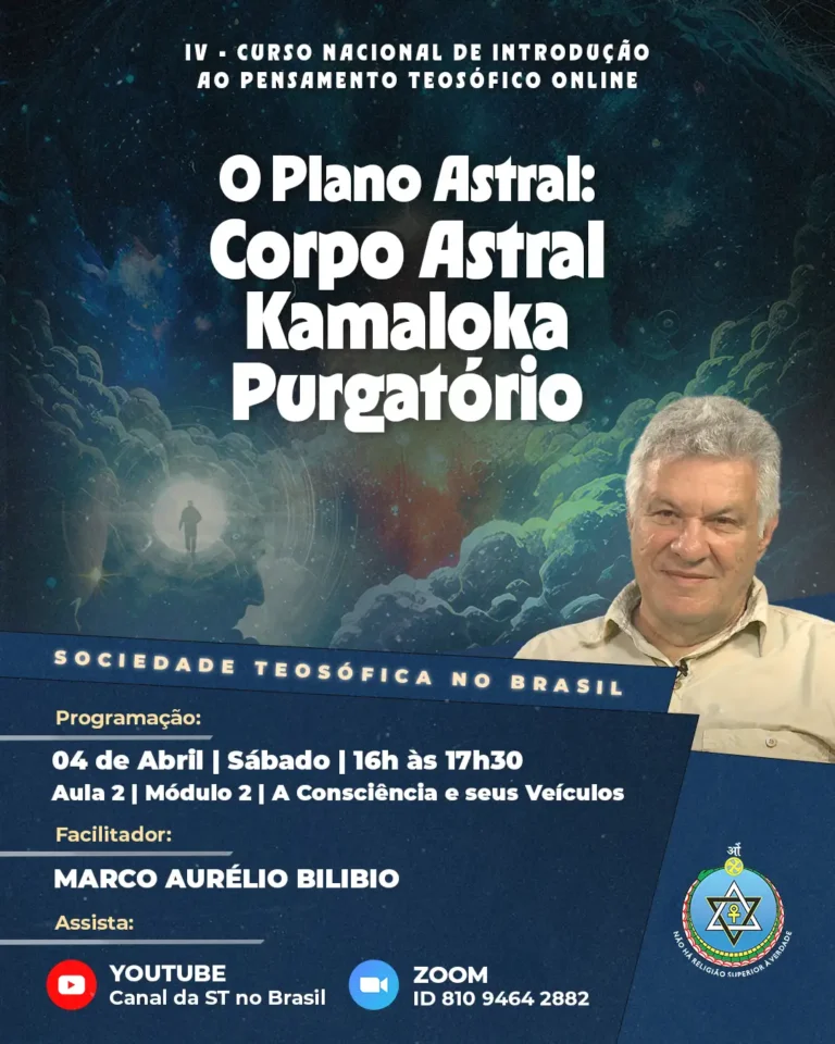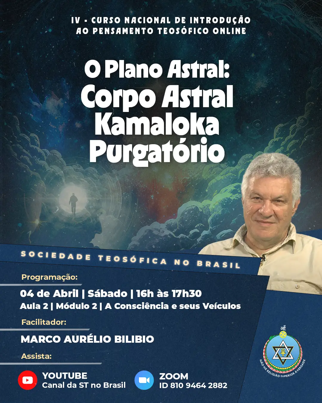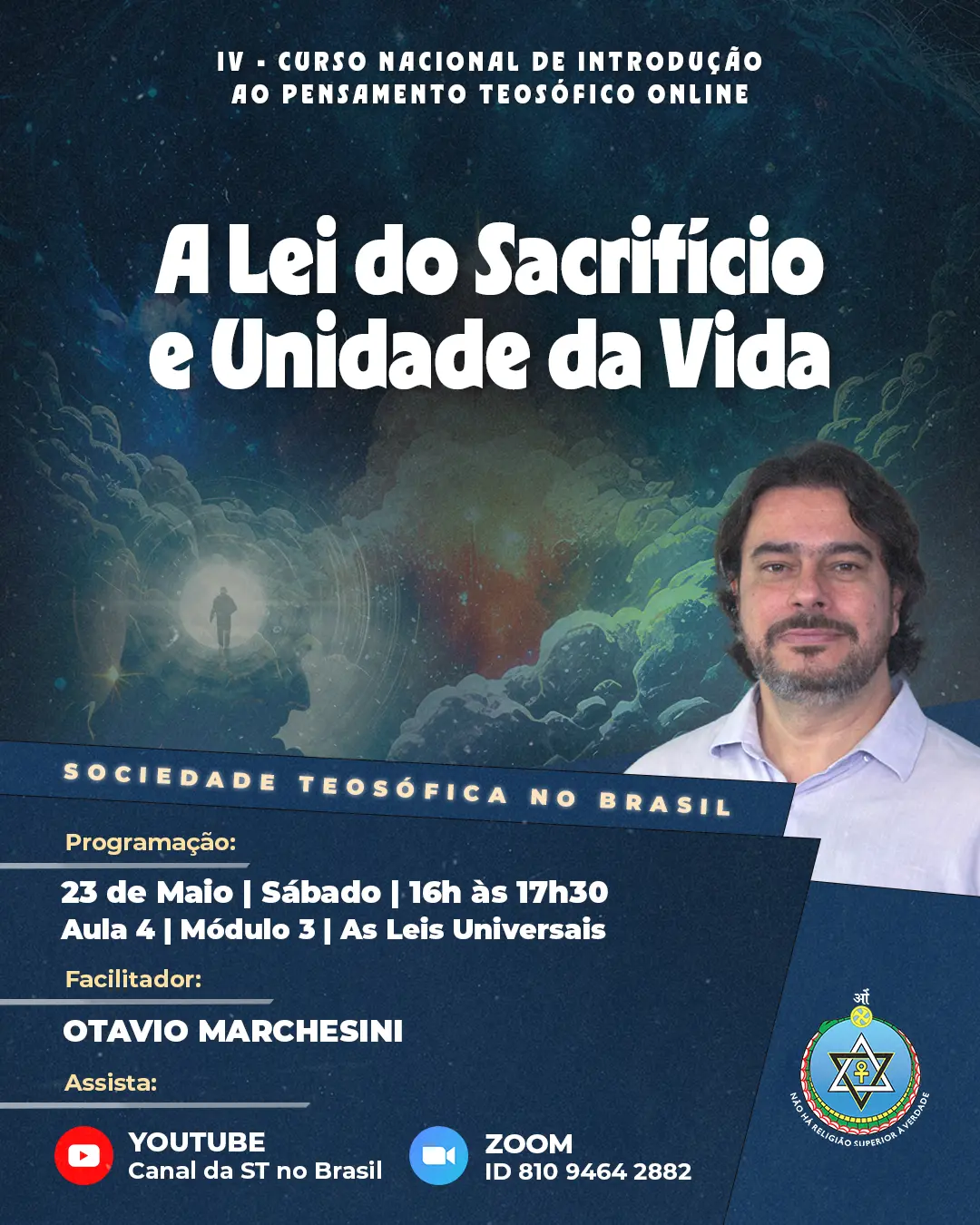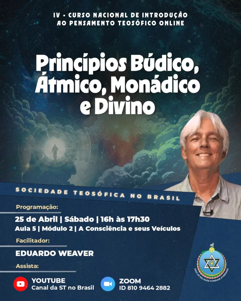 A Doutrina Secreta é a obra central do movimento teosófico moderno. Em nossa Escola Internacional faremos uma imersão em seu conteúdo, aprofundando reflexões sobre a Sabedoria das Idades com momentos de estudo e meditação contemplativa — explorando ensinamentos sobre a origem do universo, a evolução da humanidade e as leis espirituais que regem a vida, integrando ciência, filosofia e espiritualidade em uma visão profunda e transformadora.